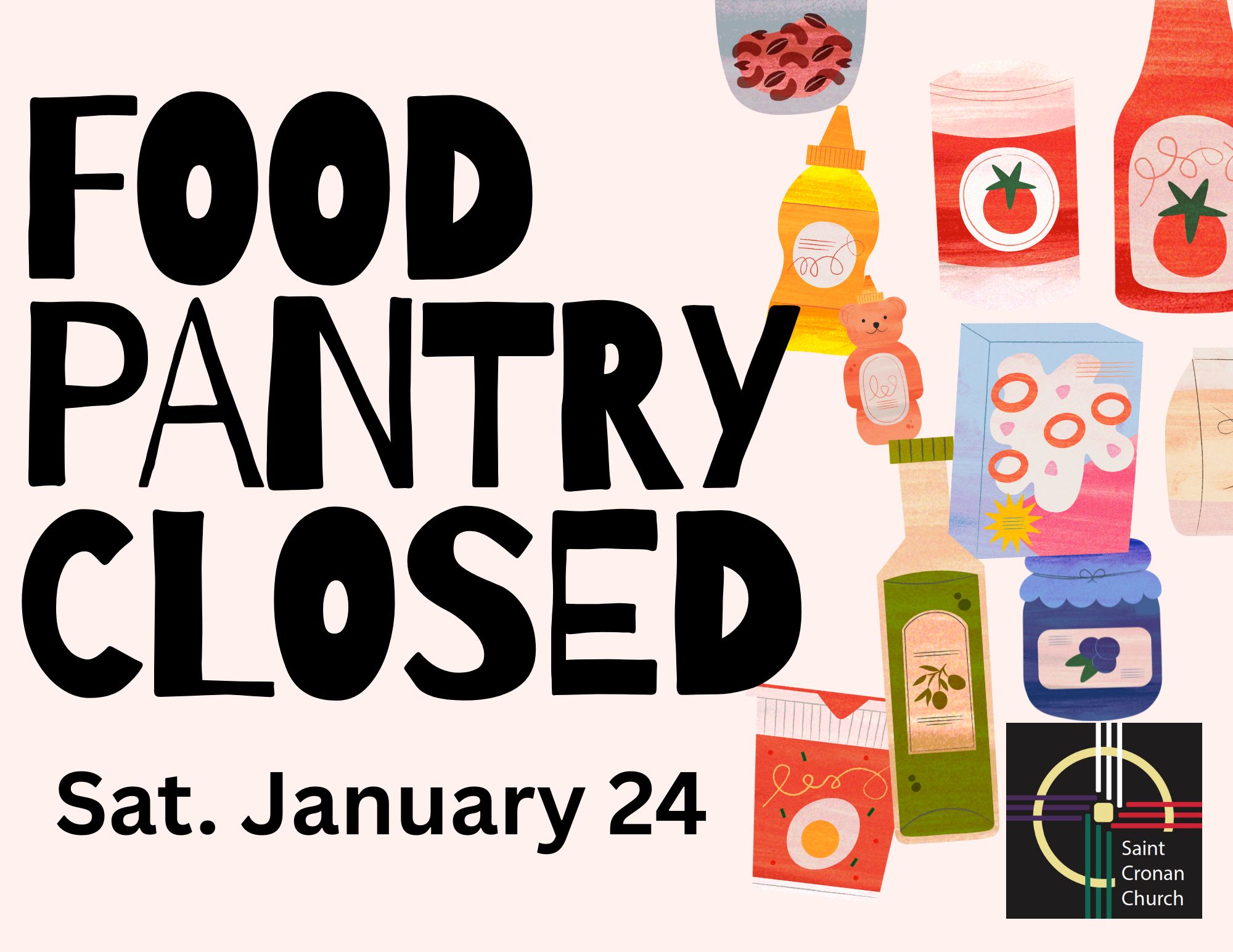 Due to the extreme cold and the threat of inclement weather, St. Cronan’s Food pantry will be closed Saturday, January 24. If you are a pantry client, please contact the church office during regular business hours to arrange a time to pick up your pantry items. 314-289-9384 Mon-Fri 9am -3pm